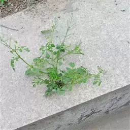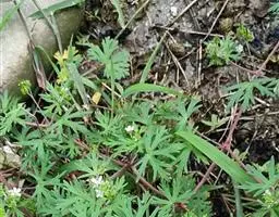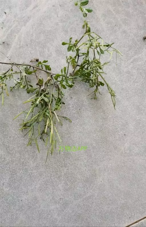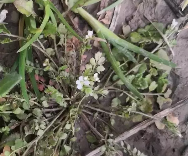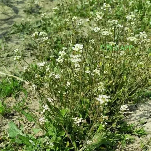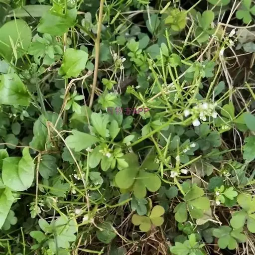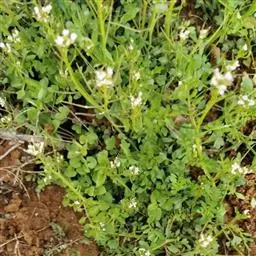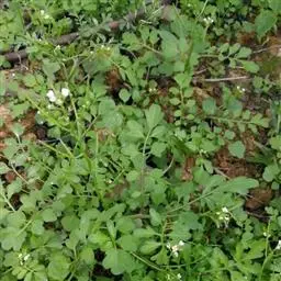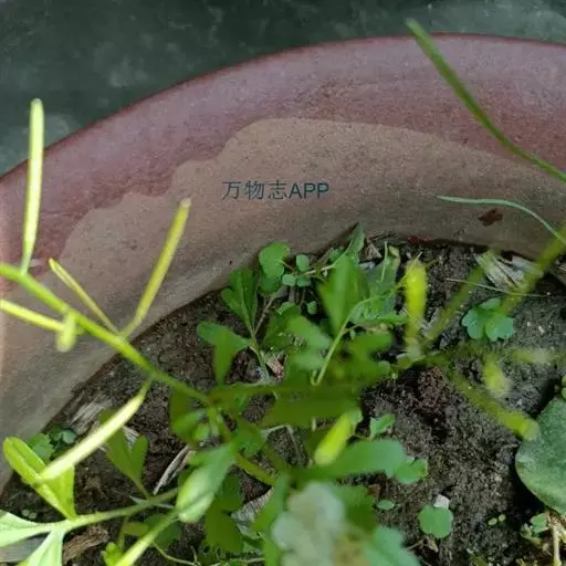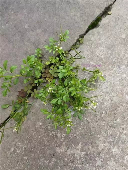 碎米荠(Cardamine hirsuta L. ):为罂粟目、十字花科、碎米荠属一年生小草本,高15-35厘米。茎直立或斜升,下部有时淡紫色,上部毛渐少。基生叶具叶柄,顶生小叶肾形或肾圆形;茎生叶具短柄;全部小叶两面稍有毛。总状花序生于枝顶,花小,花梗纤细;萼片绿色或淡紫色,长椭圆形,外面有疏毛;花瓣白色,倒卵形。长角果线形,稍扁,无毛;果梗纤细,直立开展。种子椭圆形,顶端有的具明显的翅。花期2-4月,果期4-6月。