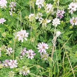 小冠花(学名:Securigera varia(L.) Lassen)是豆科,小冠花属多年生草本植物,茎直立,粗壮,多分枝,疏展,高可达100厘米。髓心白色,奇数羽状复叶,托叶小,膜质,披针形,叶柄短,小叶片薄纸质,椭圆形或长圆形,两面无毛;小脉不明显;小托叶小;小叶柄无毛;伞形花序腋生,花密集排列成绣球状,苞片披针形,宿存;花梗短;花萼膜质,萼齿短于萼管;花冠紫色、淡红色或白色,旗瓣近圆形,翼瓣近长圆形;龙骨瓣先端成喙状,喙紫黑色,荚果细长圆柱形,各荚节有种;种子长圆状倒卵形,6-7月开花,8-9月结果。