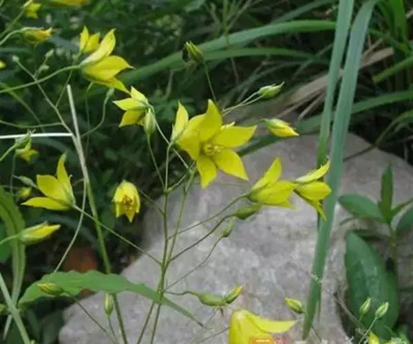 花4-11朵组成顶生和腋生的疏松总状花序;总梗纤细,长6-12厘米;花梗丝状,常近水平伸展,长1-3厘米;苞片小,钻形,长3-5毫米;花萼长5-7毫米,分裂近达基部,裂片披针形,宽1-1.5毫米,有暗紫色腺条和腺点,边缘膜质;花冠黄色,直径12-15毫米,基部合生部分长1.5-2毫米,裂片菱状卵圆形至狭长圆形,长约5毫米,宽3-4毫米,先端锐尖,有明显的脉纹,上部常散生暗紫色短腺条;花丝下部合生成高2-2.5毫米的筒,分离部分长1.5-3.5毫米;花药线状长圆形,长约1.2毫米;花粉粒具3孔沟,近圆球形[24-27.5) × (23-25) 微米],表面具网状纹饰;子房无毛,花柱丝状,长5-6毫米。