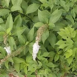 叶对生,卵状披针形,长4-10厘米,宽1.2-3.2厘米,先端长渐尖或近尾状,基部圆形,无柄或近于无柄,上面绿色,下面粉绿色,两面均有暗紫色或黑色腺点及短腺条,沿边缘尤密,中肋在上面稍隆起,侧脉纤细,4-5对,网脉不明显。