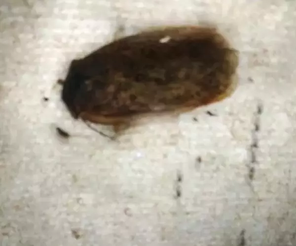 本品呈六角状椭圆形而扁平,长1.8~2.2厘米,宽1~1.2厘米,棕红色或棕黑色。头很小,略呈三角形,复眼突出呈卵圆状,单眼1对。触角5节,第1节较粗,圆筒形,长为第2节之半,其余4节较细长而 扁,第2节长于第3节,二三两节长度比约为4:3至5:3,触角多脱落。背部有翅2对、胸足3对,后足最长,多数脱落。质脆。有特异腥臭,味微咸。