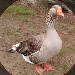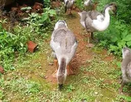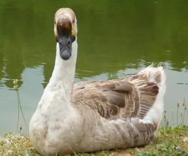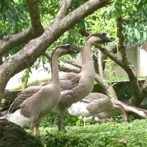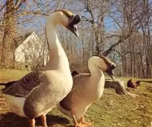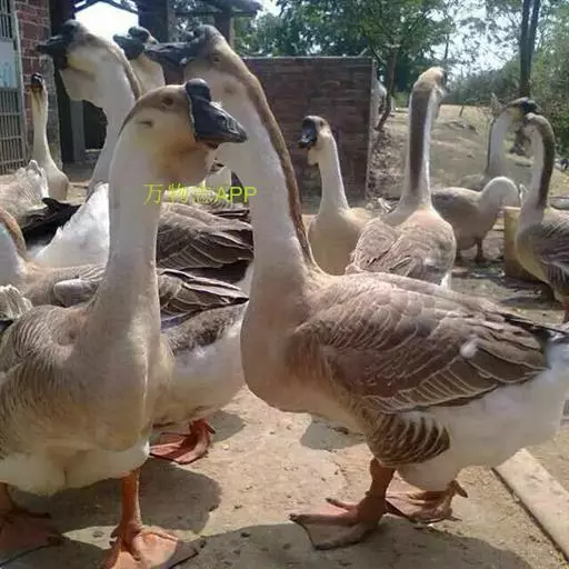 狮头鹅 羽毛灰褐色或银灰色,腹部羽毛白色。头大而眼小,头部顶端和两侧具有较大黑肉瘤,鹅的肉瘤可随年龄而增大,形似狮头,故称狮头鹅。颔下肉垂较大。嘴短而宽,颈长短适中,胸腹宽深,脚和蹼为橙黄色或黄灰色,成年公鹅体重10-12公斤,母鹅9-10公斤。生长迅速,体质强健。成熟早,肌肉丰厚,肉质优良。但年产卵量少,仅有25-35个,每个卵重平均约有203克左右。极耐粗饲,食量大。75-90日龄的肉用鹅,体重为5-7.5公斤。行动迟钝,觅食能力较差。有就巢性,现已向全国各地推广。
