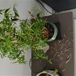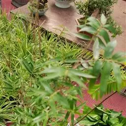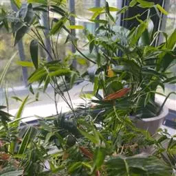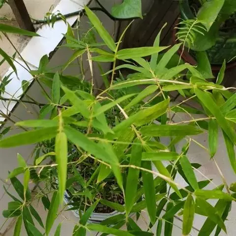凤尾竹 Raeusch. ex Schult. ’Fernleaf’ R. A. Young)是禾本科,簕竹属孝顺竹的变种。植株较高大,杆高可达6米,竿中空,小枝稍下弯,下部挺直,绿色;竿壁稍薄;节处稍隆起,无毛;叶鞘无毛,纵肋稍隆起,背部具脊;叶耳肾形,边缘具波曲状细长繸毛;叶舌圆拱形,叶片线形,上表面无毛,下表面粉绿而密被短柔毛,小穗含小花,中间小花为两性;外稃两侧稍不对称,长圆状披针形,先端急尖;内稃线形,脊上被短纤毛,花药紫色,子房卵球形,羽毛状。成熟颖果未见。原产中国,华东、华南、西南以至台湾、香港均有栽培。凤尾竹喜温暖、湿润和阳光充足的环境,耐寒。宜土层深厚、肥沃、疏松的微酸性壤土。该种观赏价值较高,宜作庭院丛栽,也可作盆景植物。全草或根入药,味淡、微苦,性寒,有清热利湿、凉血止血、消肿解毒功效,可治痢疾、泄泻等多种病症。凤尾