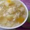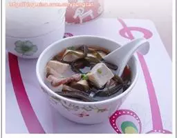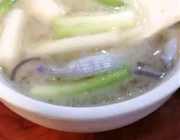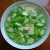盛入碗内,改成小块,炒锅放在火上,锅内放入豆油烧热,放入葱末炸出香味,加入丝瓜炒至发软,加入开水约1920克,烧沸约5分钟;
