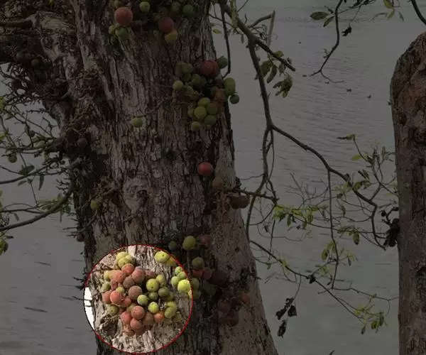 榕果聚生于老茎瘤状短枝上,稀成对生于落叶枝叶腋,梨形,直径2-2.5厘米,顶部脐状,压平,基部缢缩成柄,基生苞片3,三角状卵形,总梗长约1厘米;雄花生于榕果内壁近口部,无柄,花被片3-4,雄蕊2;瘿花和雌花有柄,花被线形,先端有3-4齿,花柱侧生,柱头棒状。成熟榕果橙红色。花期5-7月。