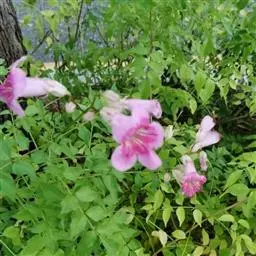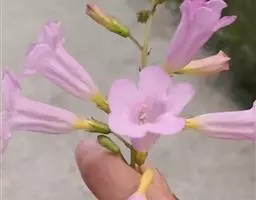 粉花凌霄 K.Schum.)是紫葳科魔盒凌霄属的落叶藤本植物。奇数羽状复叶对生,小叶全缘,…