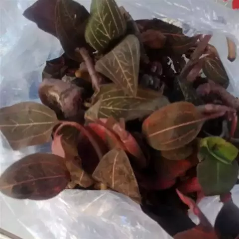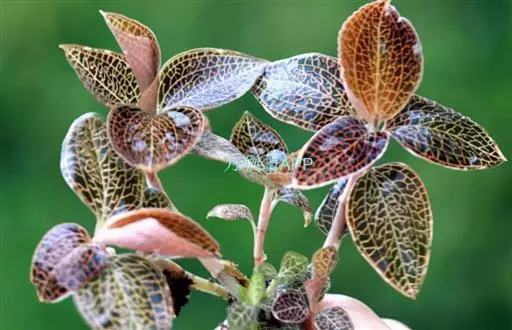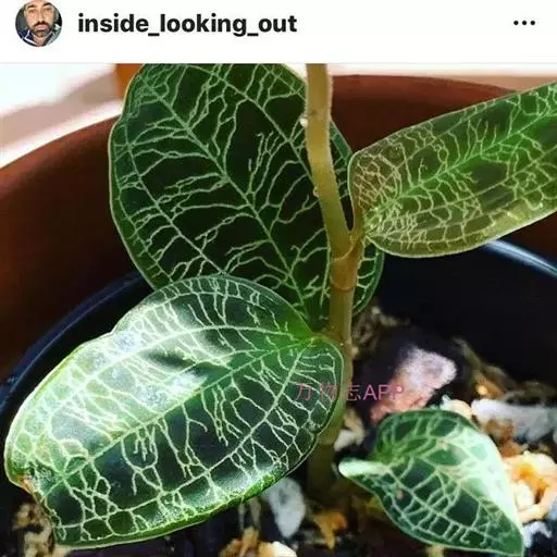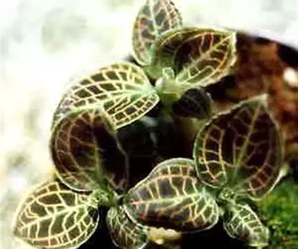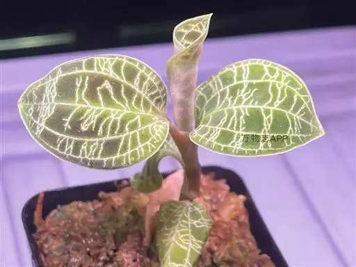 金线兰 金线兰植株高8-18厘米。根状茎匍匐,伸长,肉质,具节,节上生根。茎直立,肉质,圆柱形,具(2-)3-4枚叶。叶片卵圆形或卵形,长1.3-3.5厘米,宽0.8-3厘米,上面暗紫色或黑紫色,具金红色带有绢丝光泽的美丽网脉,背面淡紫红色,先端近急尖或稍钝,基部近截形或圆形,骤狭成柄;叶柄长4-10毫米,基部扩大成抱茎的鞘。