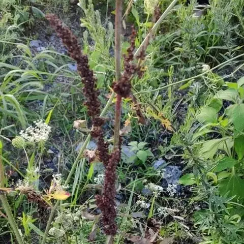 圆锥花序顶生,直立,圆柱形,长达25厘米,直径1-2.5厘米,不分枝或分枝,由多数穗状花序形成,侧生穗较短,可达6厘米,花簇在花序上排列极密;苞片及小苞片卵状钻形,长4-5毫米,为花被片长的2倍,绿色或紫红色,背部中脉隆起,成长凸尖;花被片矩圆形,长2-2.5毫米,顶端急尖或渐尖,绿色或紫红色,有1深色中脉,成长凸尖;柱头2-3。胞果近菱状卵形,长3-4毫米,环状横裂,绿色,上部带紫色,超出宿存花被。