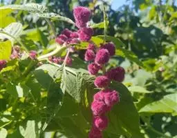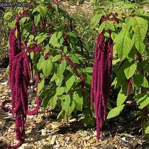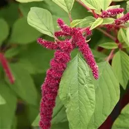 千穗谷(Amaranthus hypochondriacus L.)一年生草本;茎绿色或紫红色,分枝,无毛或上部微有柔毛。叶片菱状卵形或矩圆状披针形,具凸尖,基部楔形,无毛,上面常带紫色;叶柄无毛。圆锥花序顶生,直立,圆柱形,不分枝或分枝,由多数穗状花序形成,花簇在花序上排列极密;苞片绿色或紫红色,背部中脉隆起;花被片矩圆形,绿色或紫红色。胞果近菱状卵形,环状横裂,绿色,上部带紫色,超出宿存花被。种子近球形,白色,边缘锐。花期7-8月,果期8-9月。
