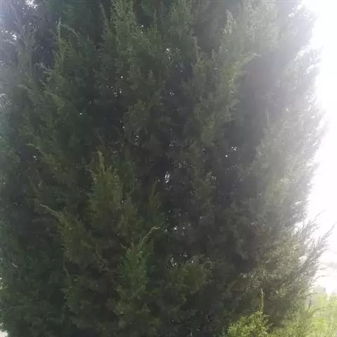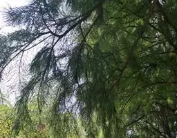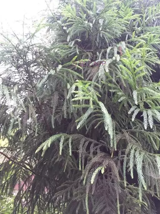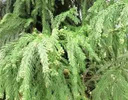 乔木,在原产地高达40米,胸径可达2米以上;树皮红褐色,纤维状,裂成条片状落脱;大枝常轮状着生,水平开展或微下垂,树冠尖塔形;小枝下垂,当年生枝绿色。