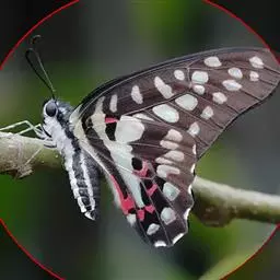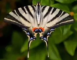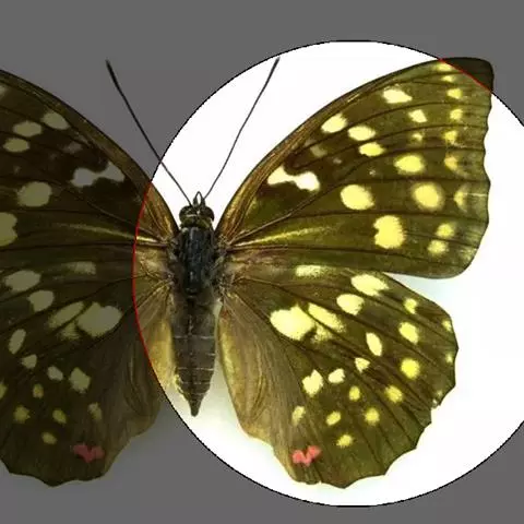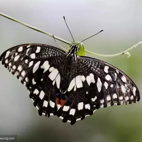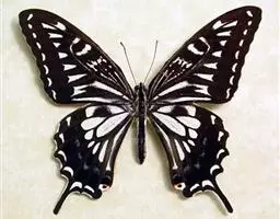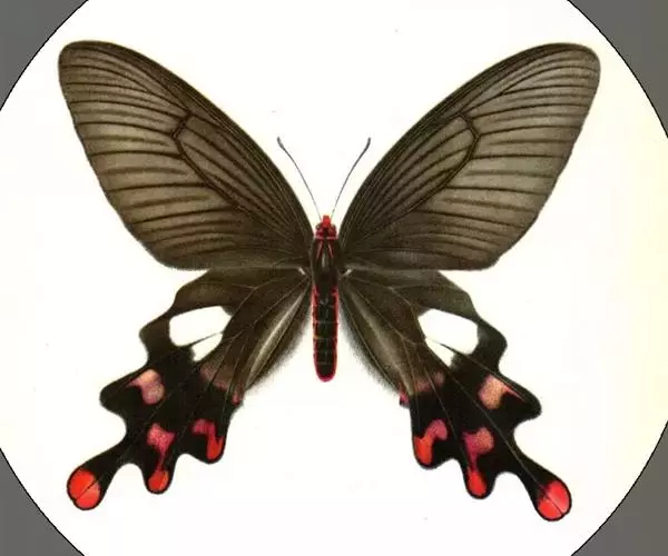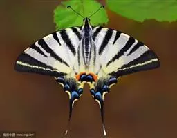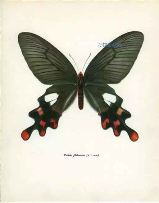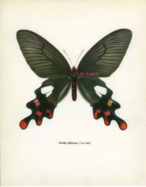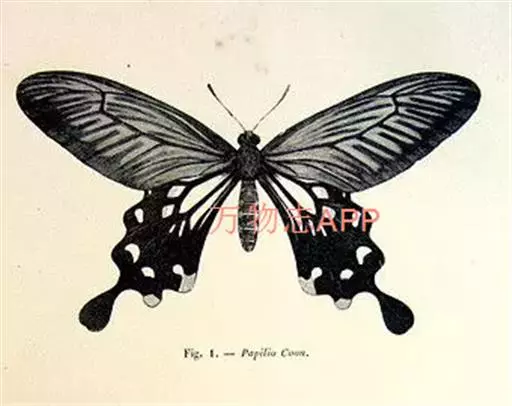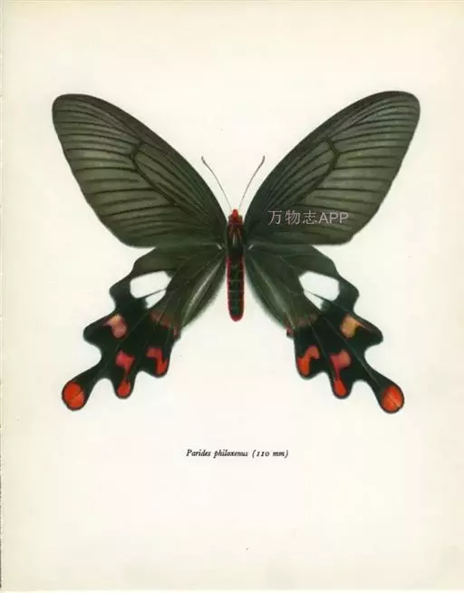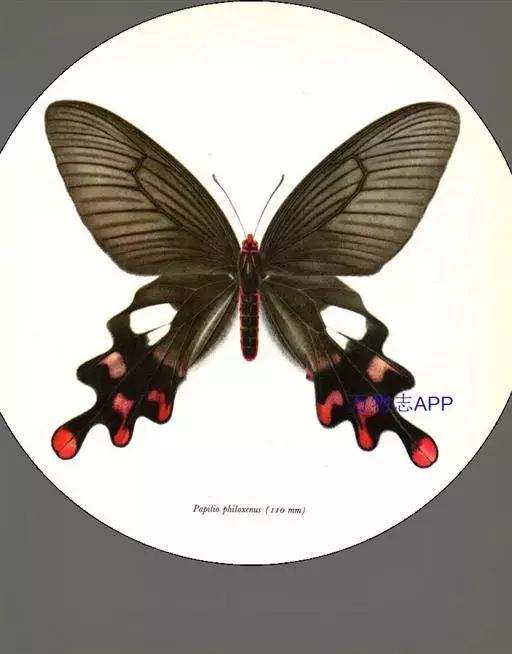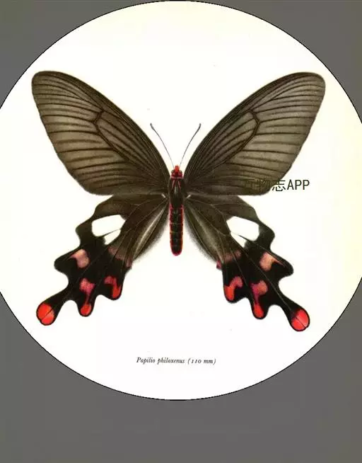 形态 成虫:翅展80—90 mm。翅黑色,脉纹两侧灰白色或黄褐色。两翅中室及前翅翅脉间有黑色条纹。后翅窄,向末端加宽,中室外有1列4—5个大白斑,外缘有5个红斑,尾突上有1个略呈圆形的红斑。翅反面与正面相似。