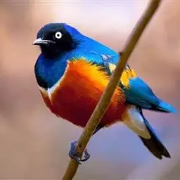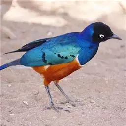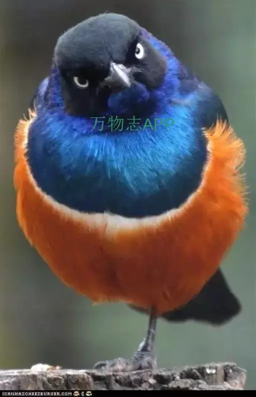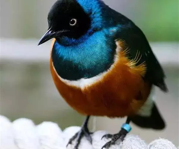 成鸟有黑色的头部,前胸、翅膀和尾巴极具光泽,整体有蓝色至绿色的背影。胸部蓝色,其次是白色的斑纹,下腹部是桔红色,尾下覆羽(羽毛)和翼衬白色。幼鸟的羽毛乏味,胸部下方的白色带界限不太明显。最初眼睛为棕色,然后变成灰白色、奶油色的眼睛,直到达到成年的着色。