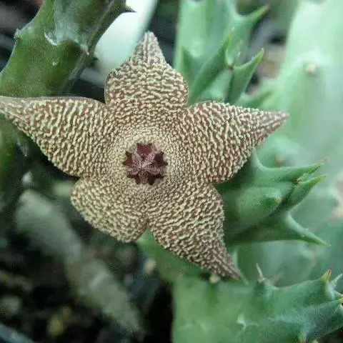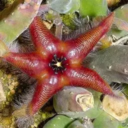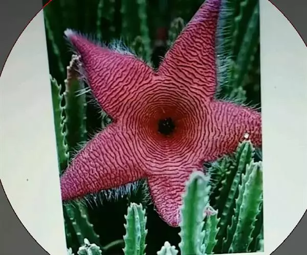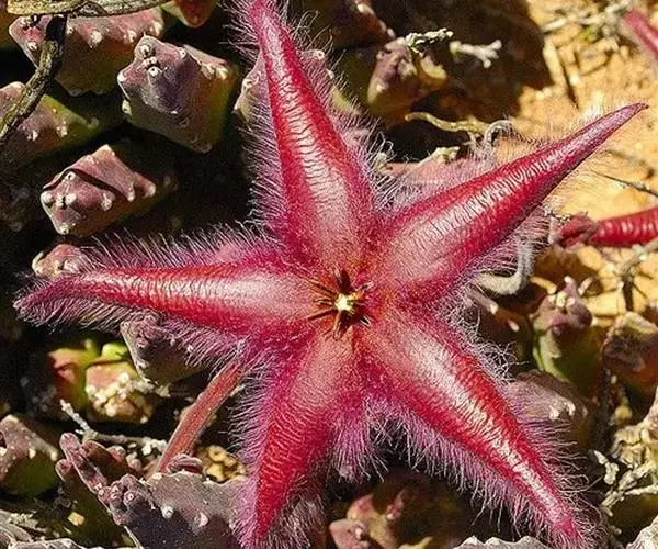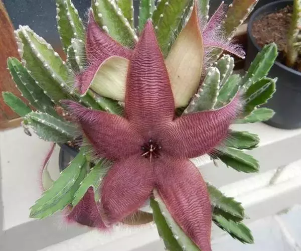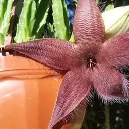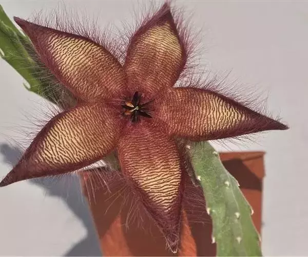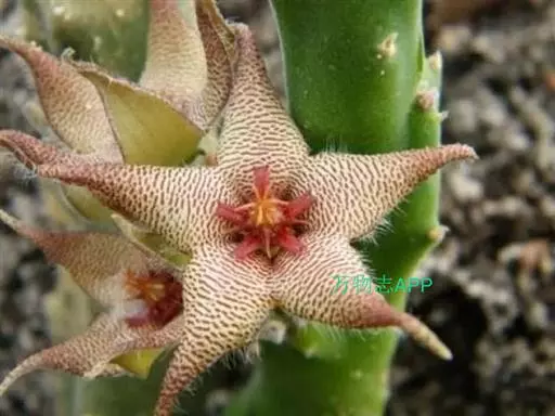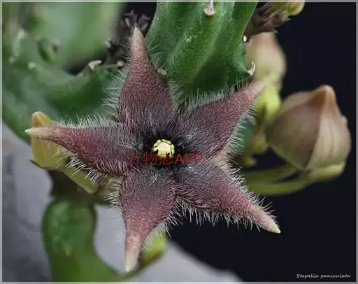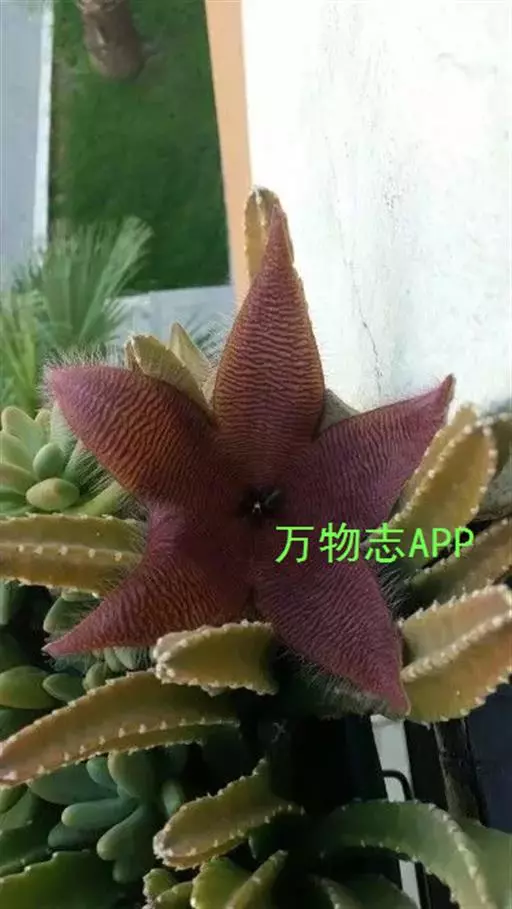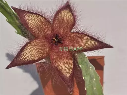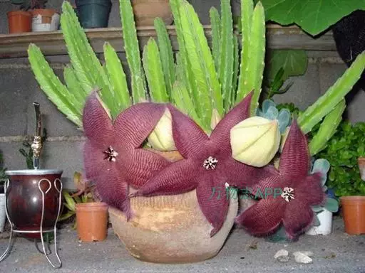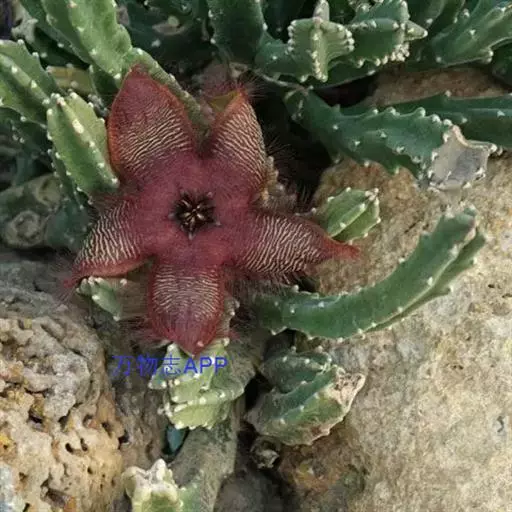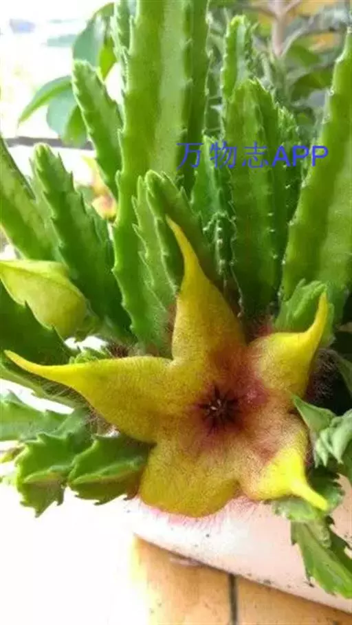 犀角(Stapelia luxurians Dammann ex Rust):其肉质茎青绿色,四棱柱形基部分枝群生,棱间下凹,具稀疏自钰聋状缘。花星形,直径10-12厘米紫红褐色,具淡黄色波状横纹,花瓣学被紫色毫毛。夏、秋季节开放。