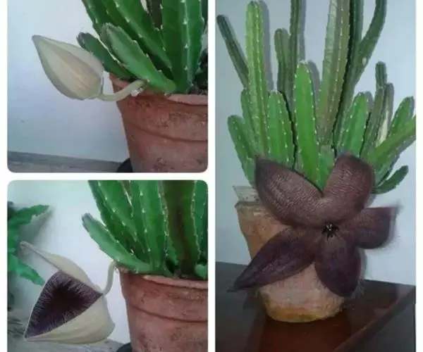 多年生肉质植物,植株丛生,四棱柱状茎直立向上生长,高20-30厘米,粗3-4厘米,表皮灰绿色,不光滑。棱缘色稍浅,具肉质齿及很短的软毛。花1-3朵从嫩茎的基部长出,大型,直径15-20厘米,星状呈5裂张开,淡黄色,具暗紫色波状横纹,边缘密生紫色细长毛。夏、秋季节开放。