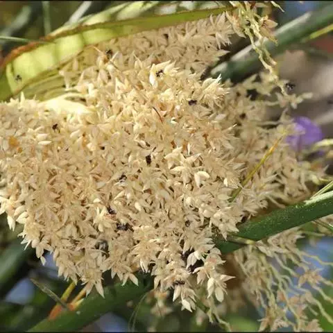 花序腋生,花未见。果序长0.8-1.1米,多分枝,在花的着生处具小瘤突。果实椭圆形,较大,长3-3.5厘米,直径2-2.5厘米,干后淡蓝色;种子椭圆形或卵球形,长约2.3厘米,直径约1.6厘米,胚位于种脊对面的中央。果期6月。