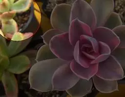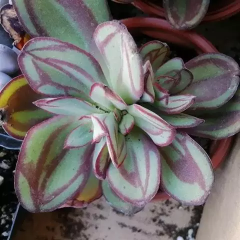 紫珍珠是景天科石莲花属的多年生肉质草本植物。植株中小型;叶片肉质,匙形,呈莲座状紧密排列;叶片粉紫色,…