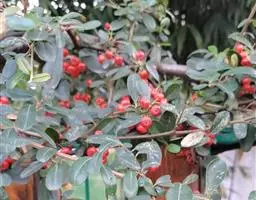 火棘 H. L. Li)是蔷薇科火棘属常绿灌木,老枝呈暗褐色;叶片呈倒卵形,边缘有钝锯齿,齿尖向内弯,…