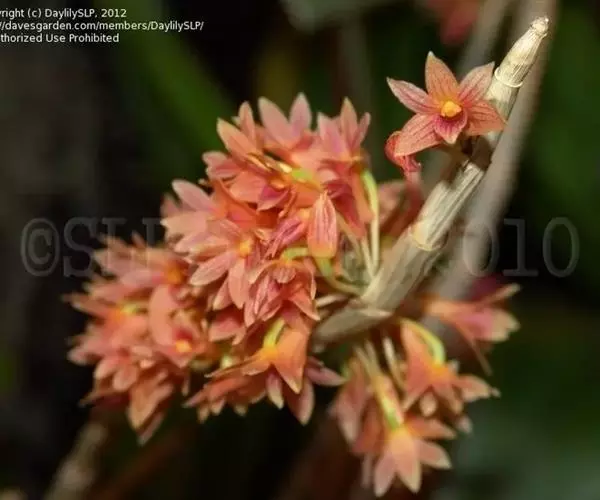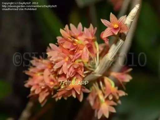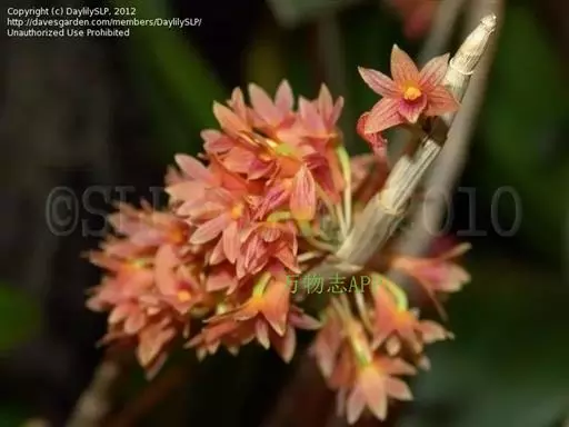 红花石斛(学名:Dendrobium miyakei Schltr.):茎直立或悬垂,圆柱形,有时中部增粗而稍呈纺锤形,基部收窄,不分枝,具多个节。叶薄革质,披针形或卵状披针形。总状花序出自落了叶的老茎上,呈簇生状,密生6-10朵花;花鲜红色,不甚张开;花瓣斜倒卵状长圆形,等长于中萼片而稍较狭,先端锐尖,基部收狭,具3条脉;唇瓣匙形,长1.5-2.2厘米,宽7-8.5毫米,先端稍钝,基部具狭的爪,全缘。花期3-11月常不定时开放。
