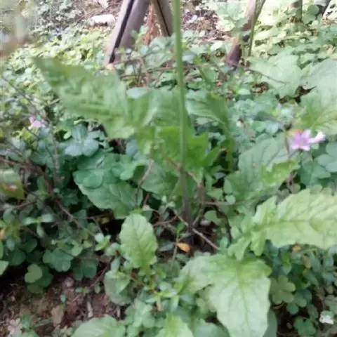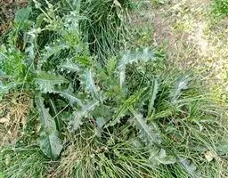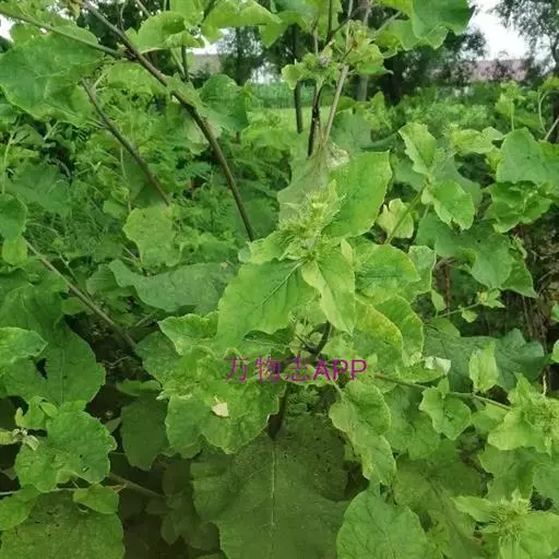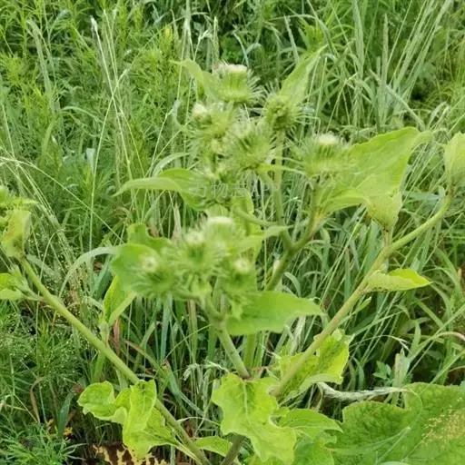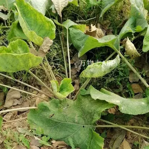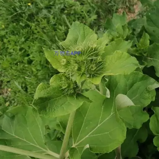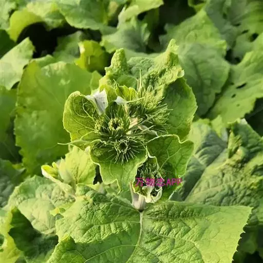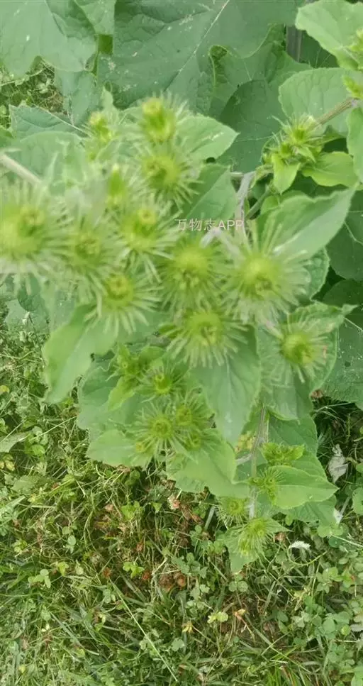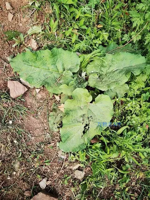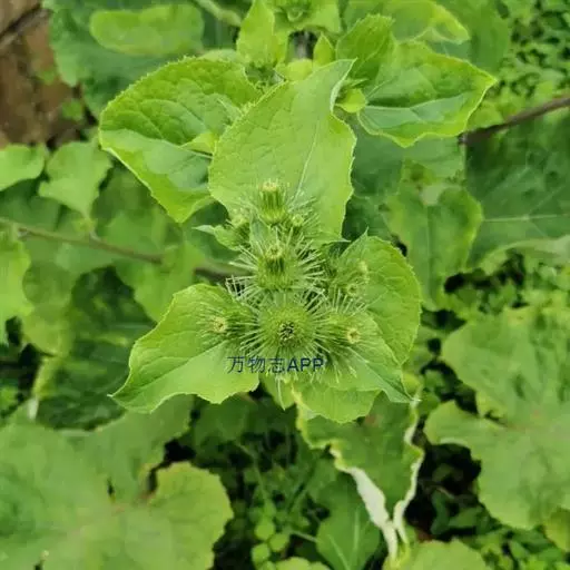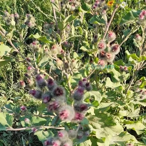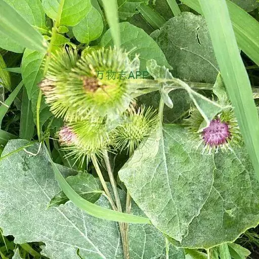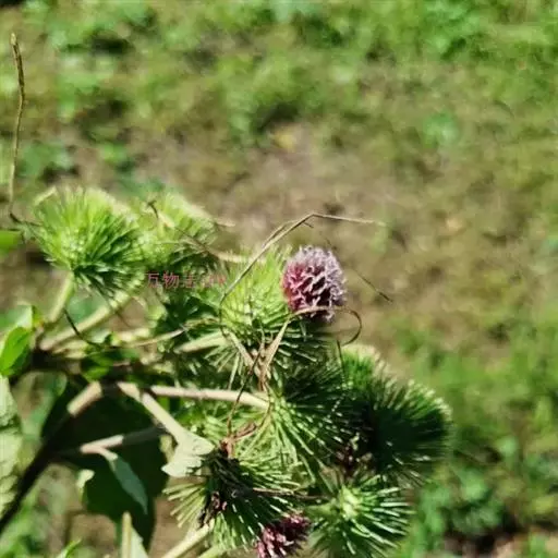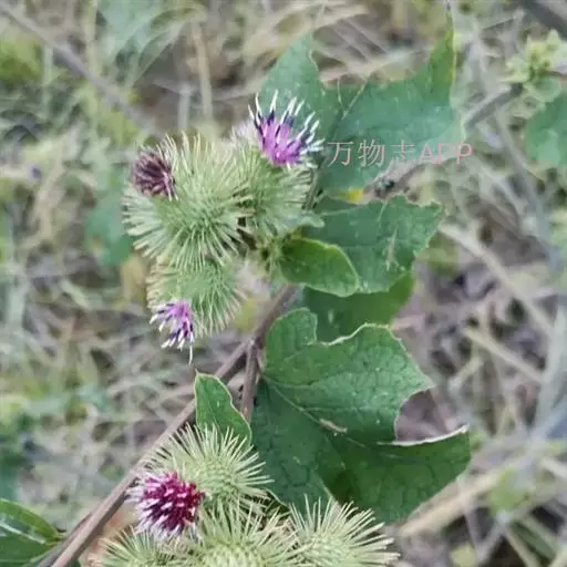 牛蒡 二年生草本,具粗大的肉质直根,长达15厘米,径可达2厘米,有分枝支根。茎直立,高达2米,粗壮,基部直径达2厘米,通常带紫红或淡紫红色,有多数高起的条棱,分枝斜升,多数,全部茎枝被稀疏的乳突状短毛及长蛛丝毛并混杂以棕黄色的小腺点。