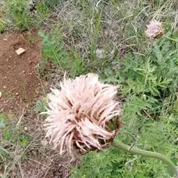 头状花序多数或少数在茎枝顶端排成疏松的伞房花序或圆锥状伞房花序,花序梗粗壮。总苞卵形或卵球形,直径1.5-2厘米。总苞片多层,多数,外层三角状或披针状钻形,宽约1毫米,中内层披针状或线状钻形,宽1.5-3毫米;全部苞近等长,长约1.5厘米,顶端有软骨质钩刺。小花紫红色,花冠长1.4厘米,细管部长8毫米,檐部长6毫米,外面无腺点,花冠裂片长约2毫米。