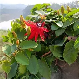 红花西番莲 是西番莲科、西番莲属多年生草质藤本,茎圆形,具卷须,长6-8米。叶互生,长圆形至长卵形,…