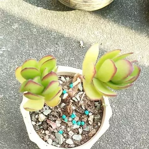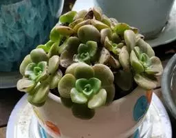 茎叶多肉化,叶色灰白至灰绿,叶片表面有淡淡的白粉,叶尖在阳光下会出现轻微的粉红色,茎健壮,互生叶排列成莲座形,叶片倒卵形,先端急尖,白色的叶子如牡丹花绽开,子株坚韧而繁多。歧伞花序自叶腋伸出,花半开形,5枚花瓣浓黄色,颜色透明,花瓣上有红色细点,开花期春季。