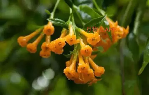 灌木,全体近无毛或在嫩枝上有短柔毛。叶有柄,柄长1-1.4厘米;叶片卵形或椭圆形,长4-7厘米,宽2-4厘米,上面深绿色,下面淡绿,顶端急尖,基部近圆形或阔楔形,全缘,有侧脉5-6对。总状式聚伞花序,顶生或腋生;苞片叶状,早落;花近无梗。花萼钟状,有5条纵肋,长约6毫米,萼齿5,长不及1毫米;花冠筒状漏斗形,金黄色,筒在基部紧缩,向檐部渐渐扩大成棒状,长2厘米左右,裂片卵状三角形,开展或向外反折,长约3.5毫米;雄蕊及花柱伸达花冠喉部,花丝基部有分离的附属物。浆果梨状。 [1-2]