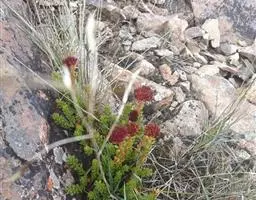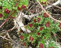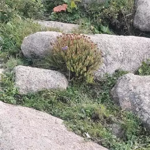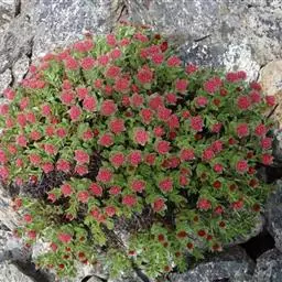 高山红景天〔学名:Rhodiola cretinii (Hamet)H. Ohba subsp. sino-alpina (Frod.))H. Ohba〕景天科:红景天属多年生草本植物,高达5厘米。根颈细,叶互生,花茎全部疏生,花序顶生,雌株有花,聚伞状着生。花常为四基数;雌花淡绿色或白色,8月初开花。7-8月结果,