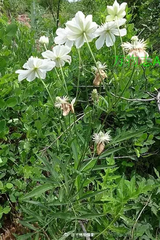 花序顶生,聚伞花序或为总状、圆锥状聚伞花序,有时花单生,花直径2.5-5厘米;萼片4-8,通常6,白色,长椭圆形或狭倒卵形,长1-2.5厘米,宽0.3-1(-1.5)厘米卜,外面密生棉毛,花蕾时象棉花球,内面无毛;雄蕊无毛。瘦果倒卵形,扁平,密生柔毛,宿存花柱长1.5-3厘米,有灰白色长柔毛。花期6月至8月,果期7月至10月。