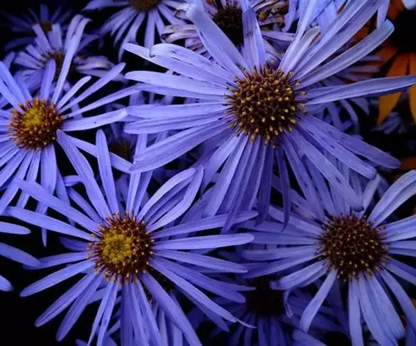 头状花序多数,径2.5-4.5厘米,在茎和枝端排列成复伞房状;花序梗长,有线形苞叶。总苞半球形,长7-9毫米,径10-25毫米;总苞片3层,线形或线状披针形,顶端尖或圆形,外层长3-4毫米,宽1毫米,全部或上部草质,被密短毛,内层长达8毫米,宽达1。5毫米,边缘宽膜质且带紫红色,有草质中脉。舌状花约20余个;管部长3毫米,舌片蓝紫色,长15-17毫米,宽2.5-3.5毫米,有4至多脉;管状花长6-7毫米且稍有毛,裂片长1.5毫米;花柱附片披针形,长0.5毫米。