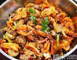 香锅虾是一道美食,制作原料主要有新鲜海虾、藕、洋葱。