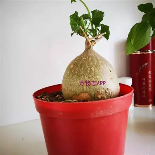 肉质块根植物,茎块部分外露在地表面,直径能达1米,看上去像一块表面圆滑的大石头,表面土黄色,表皮坚硬,外形似大肚皮和尚的肚皮义似一放倒于地上的大伽袋而得名。绿叶茂盛,藤条能从茎块部分分叉数根,攀附能力强,可达10米以上,叶呈倒五角形,春天开花,具香味。