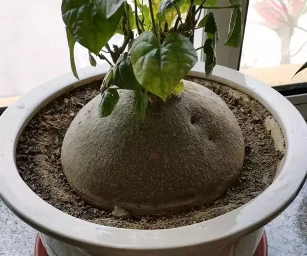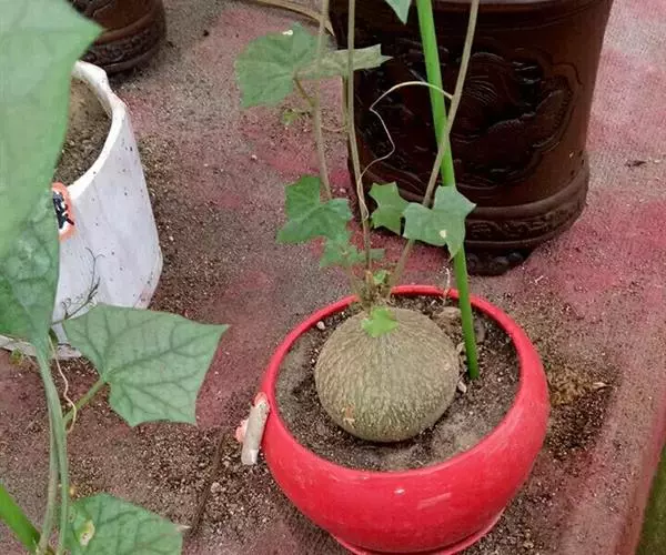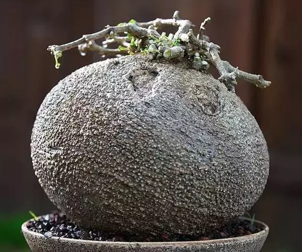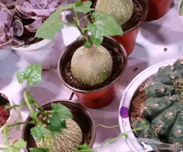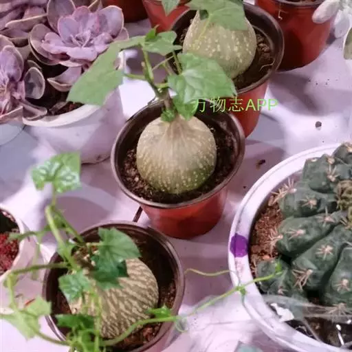 块根初期表皮呈现绿色,2年后表皮呈现银白色,3年后变成微白的褐色,播种苗2年的球体约2厘米,4年的球体约5-6厘米,5年以后生长迅速,10年的球体直径可达1米左右,盘卧于地上,顶部生出茎蔓数十条,长可达20-30米,攀附于框架、棚顶上,遮天蔽日,在阳光的照耀下略带银白的绿色叶片在夏日阳光的照耀下,为炙热的地面投下一片阴凉。