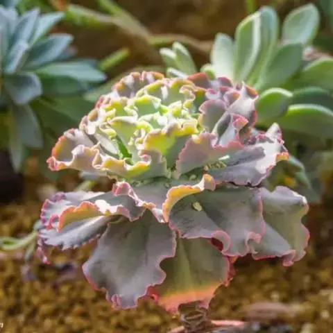 高砂之翁是景天科,拟石莲花属的多肉植物。特征是其边缘呈大波浪卷形的宽大叶片,…