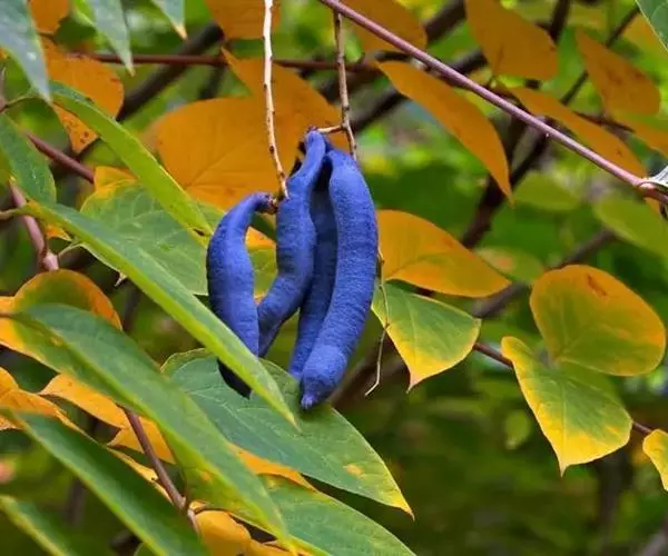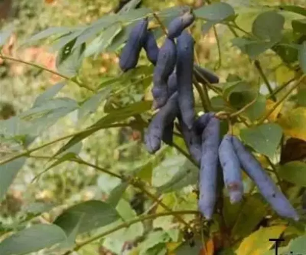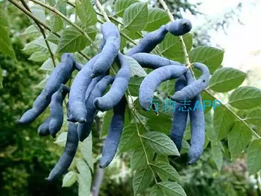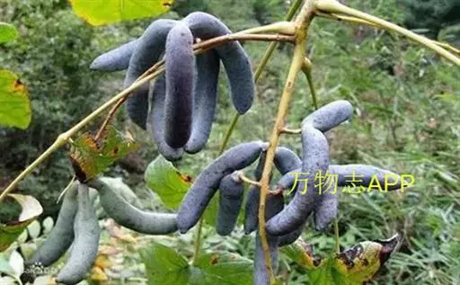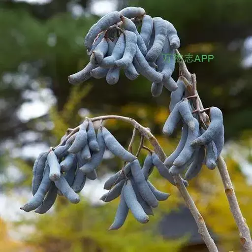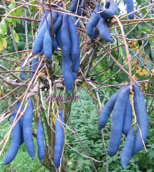 果下垂,圆柱形,蓝色,长5-10厘米,直径约2厘米,顶端截平但腹缝先端延伸为圆锥形凸头,具小疣凸,果皮表面有环状缢纹或无;种子倒卵形,黑色,扁平,长约1厘米。花期4-6月,果期7-8月。