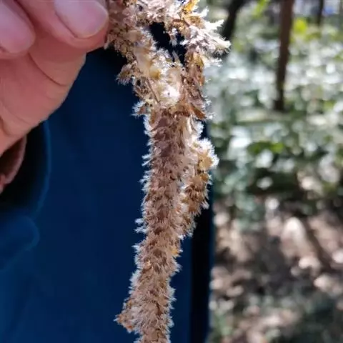 雄花序长5-6厘米,花序轴无毛,苞片膜质,淡褐色,长3-4毫米,顶端有线条状的尖锐裂片; 雄蕊15-30,花药紫红色;子房卵圆形,有柄,无毛,柱头2枚。果序长5-10厘米,果序轴无毛,蒴果卵圆形,有柄,长5-7毫米,宽3-4毫米,2瓣裂。花期4-5月,果期6月。