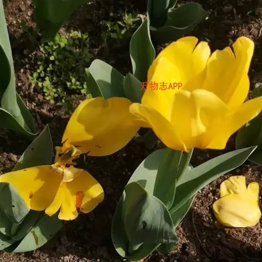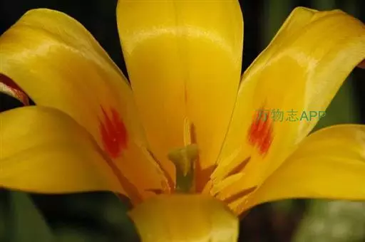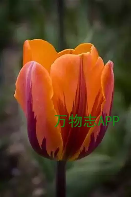 多年生草本。鳞茎偏圆锥形,直径约2-3cm,外被淡黄至棕褐色皮膜,内有肉质鳞片2-5片。茎叶光滑,被白粉。叶3-5枚,带状披针形至卵状披针形,全缘并成波形,常有毛,其中2-3枚宽广而基生。花单生茎顶,大型,直立杯状,洋红色,鲜黄至紫红色,基部具有墨紫斑,花被片6枚,离生,倒卵状长圆形,花期3-5月。蒴果室背开裂,种子扁平。
