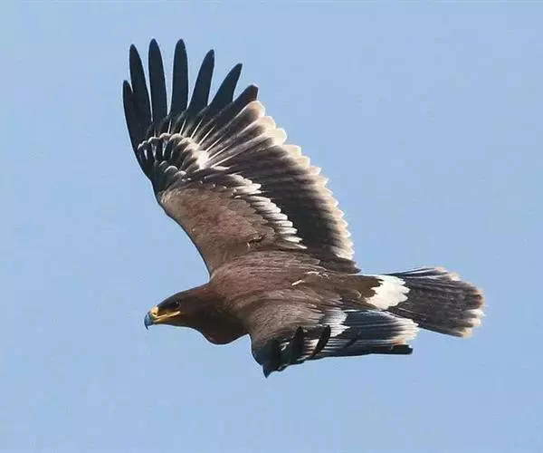 乌雕体形体长61~74厘米,体重1.310~2.100千克,为中大型猛禽。 乌雕 乌雕通体为暗褐色,背部略微缀有紫色光泽,颏部、喉部和胸部为黑褐色,其余下体稍淡。尾羽短而圆,基部有一个“V”字形白斑和白色的端斑,与草原雕不同。飞行时两翅宽长而平直,两翅不上举。虹膜为褐色,嘴黑色,基部较浅淡;蜡膜和趾为黄色,爪为黑褐色;鼻孔为圆形,而其他雕类的鼻孔均为椭圆形;尾短,蜡膜及脚为黄色。体羽随年龄及不同亚种而有变化。幼鸟翼上及背部具有明显的白色点斑及横纹。所有型的羽衣其尾上覆羽均具白色的“U”形斑,飞行时从上方可见。尾比金雕雕或白雕肩雕为短。