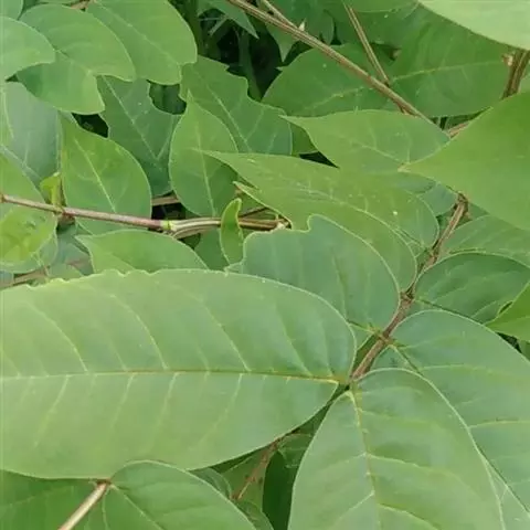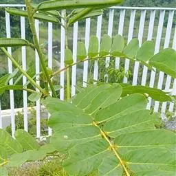 叶长10-15厘米;叶轴及叶柄呈扁四方形,在叶轴上面最下2或3对小叶之间和叶柄上部有棍棒状腺体2-3枚;小叶7-9对,长椭圆形或卵形,长2-5厘米,宽1-1.5厘米,下面粉白色,被疏散、紧贴的长柔毛,边全缘;小叶柄长1-1.5毫米,被柔毛;托叶线形,弯曲,长约1厘米,早落。