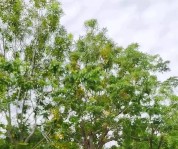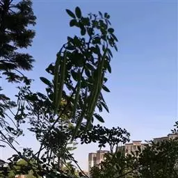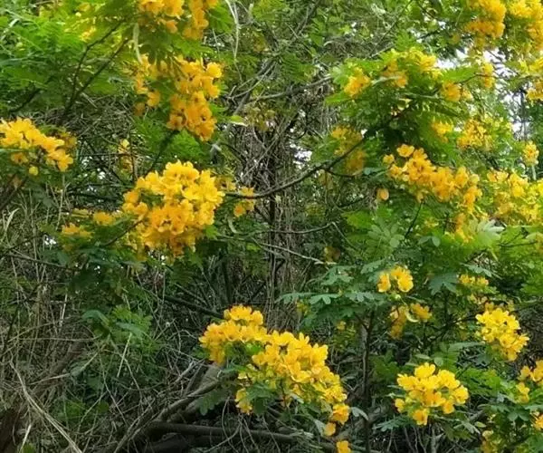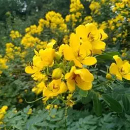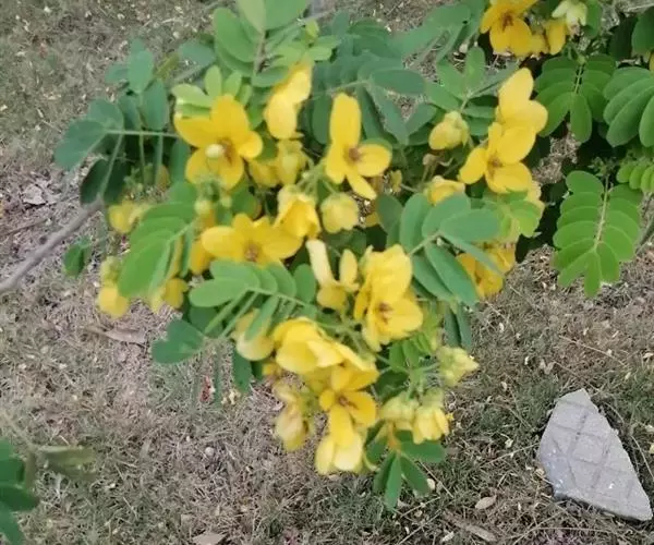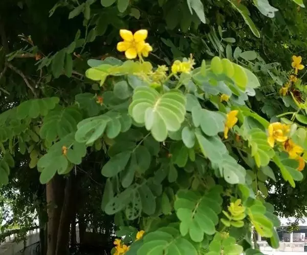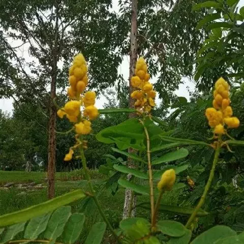 黄槐 灌木或小乔木,高5-7米;分枝多,小枝有肋条;树皮颇光滑,灰褐色;嫩枝、叶轴、叶柄被微柔毛。