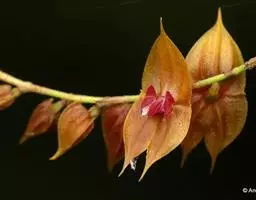 密花石豆兰(学名:Bulbophyllum odoratissimum (J. E. Smith) Lindl.):根状茎粗2-4毫米,分枝,被筒状膜质鞘,在每相距4-8厘米处生1个假鳞茎。根成束,分枝,出自生有假鳞茎的节上。假鳞茎近圆柱形,直立,顶生1枚叶,幼时在基部被3-4枚鞘。叶革质,长圆形,近无柄。花葶淡黄绿色,从假鳞茎基部发出,1-2个,直立;总状花序缩短呈伞状,常点垂,密生10余朵花;花稍有香气,初时萼片和花瓣白色,以后萼片和花瓣的中部以上转变为橘黄色;花瓣质地较薄,白色,近卵形或椭圆形,长1-2毫米,中部宽1-1.5毫米,先端稍钝,具1条脉,有时3条,但仅中肋到达先端;唇瓣橘红色,肉质,舌形,稍向外下弯。花期4-8月。