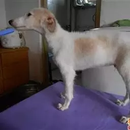 颈、背线、躯体:颈:长度适中、拱形,犬站立时,直立昂起。小跑时颈部伸展,头略微向前伸。胸:强壮,但是不太宽,正好位于肘部的后面,并且与其水平。肋骨从脊椎向外充分扩张,但是侧面扁平,以便自由活动。背部:背直而强壮,从马肩隆到臀部的背线平直。中等长度,不能因为身体过长而变圆或松弛。腰部:收紧,倾斜,比胸腔窄,轻微折起。臀部以一定的角度从脊椎处下溜,但是角度不能太陡,以免影响后腿的后蹬力。缺陷:背部松弛,无力;拱状的背部;背线倾斜。颈部过短,过粗,过长。胸部过宽;“桶状肋骨”;肋骨太平坦或无力。