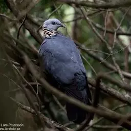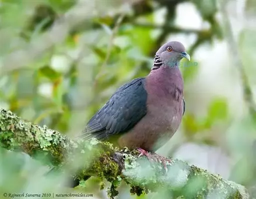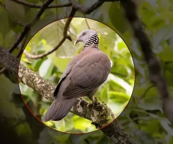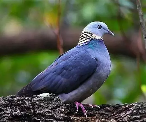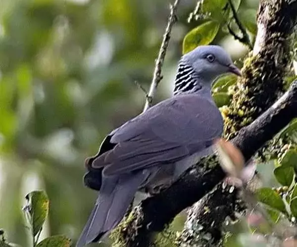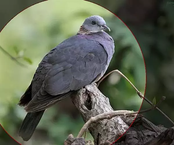 灰林鸽体型中等,体长35-40cm,头灰色、喉中央白色,颈部有淡肉黄色鳞状斑形成的颈环。上背黑褐色,具绿紫色金属光泽,下背至尾黑色。胸灰褐色,腹暗黄色,尾下覆羽皮黄色,脚深红色。