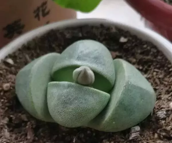 番杏科对叶花属多肉植物。原产南非开普省。非常肉质的卵形叶交互对生,基部联合,整个株形像元宝。叶外缘钝圆,表面较平,背面凸起,灰绿色有许多透明的小斑点。新叶长出后老叶慢慢皱缩,但有时一对老叶中叠生两对小叶形成三对叶共存的现象。