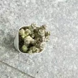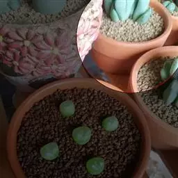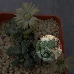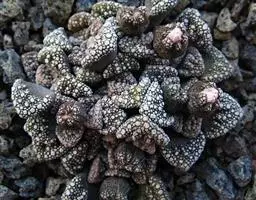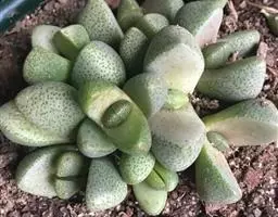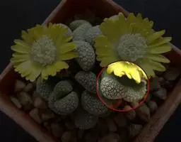 荒玉为番杏科生石花属,原产南非。株体呈白粉色,表面布满凹凸纹路,凹陷处为红褐色,每年秋季开黄花。