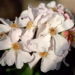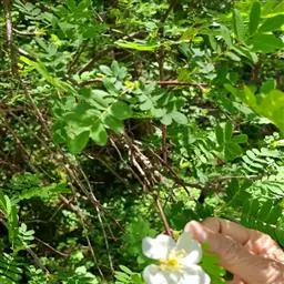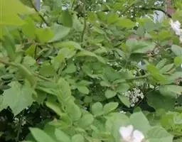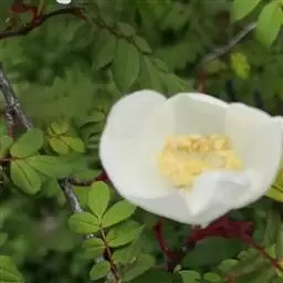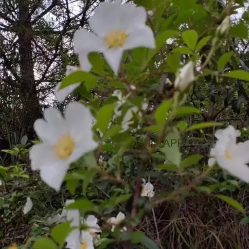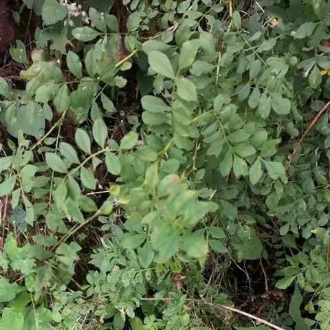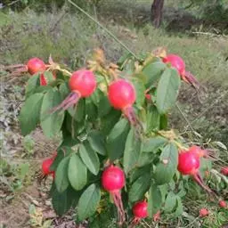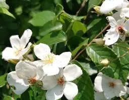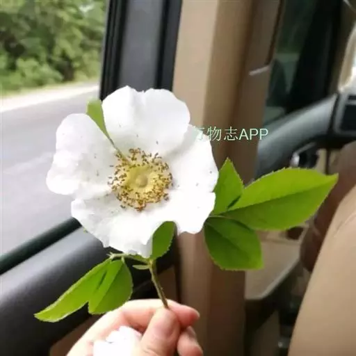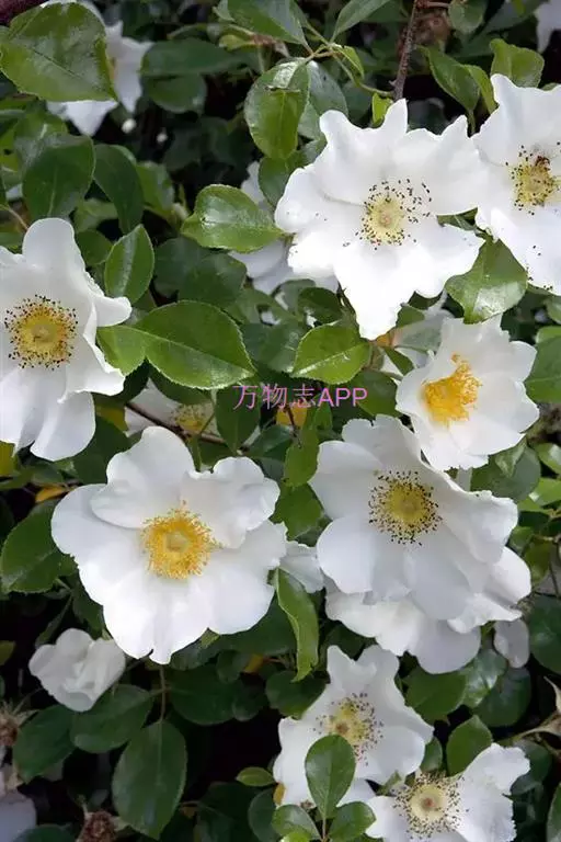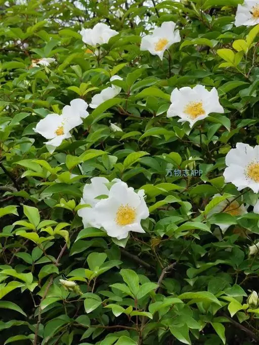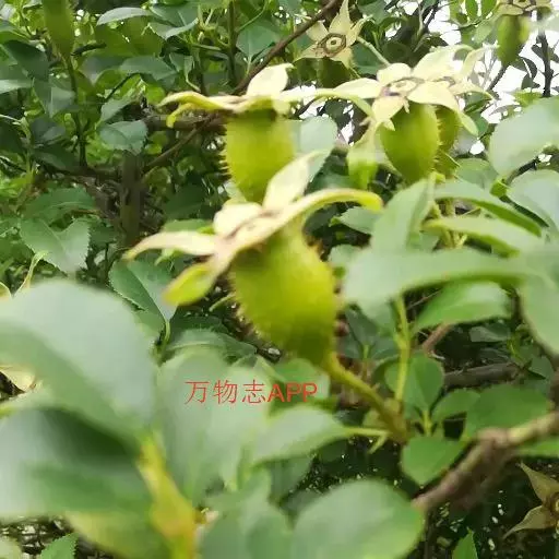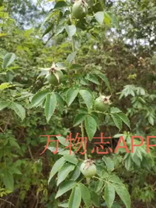 金樱子(学名:Rosa laevigata Michx.):常绿攀援灌木,高可达5米;小枝粗壮,散生扁弯皮刺,无毛。小叶革质,通常3,稀5;小叶片椭圆状卵形、倒卵形或披针状卵形,边缘有锐锯齿,上面亮绿色,无毛,下面黄绿色;托叶离生或基部与叶柄合生,披针形,边缘有细齿。花单生于叶腋,直径5-7厘米;花瓣白色,宽倒卵形,先端微凹;果梨形、倒卵形,稀近球形,紫褐色,外面密被刺毛。花期4-6月,果期7-11月。
