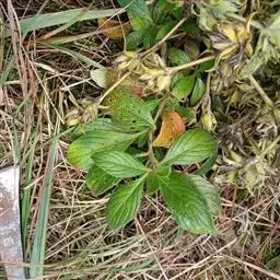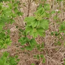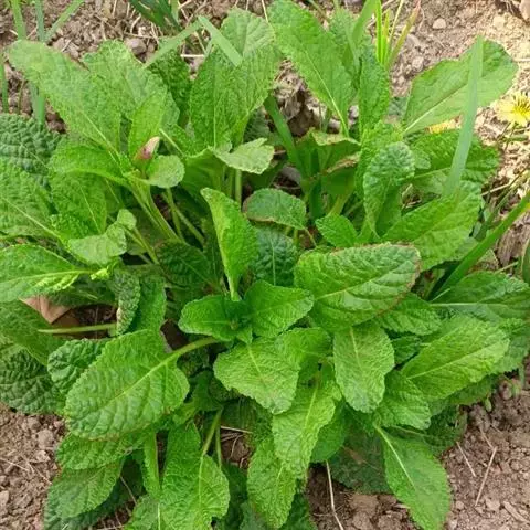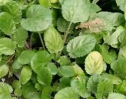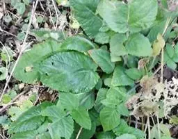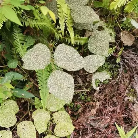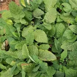 基出叶多数,卵圆形或近戟形,长7-16厘米,宽约为长的1/2,基部深心形,基片圆形或近锐尖,先端锐尖,边缘具规则的圆齿,干时绿色或淡褐色,上面略具皱,疏布贴生的短毛,下面尤其是在脉上较密被疏柔毛及密被红色腺点;叶柄长约为叶片二倍,被毛同茎。茎生叶圆形,但具较短的叶柄。