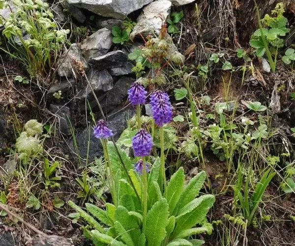花葶高30-60厘米,被柔毛或有时近于无毛;花序通常短穗状,多花,无粉或有时被黄粉;苞片舌状或披针形,长3-5毫米,边缘具小缘毛;花萼壶状,长4-5毫米,分裂略超过中部,裂片大小不等,卵圆形,外面常带紫褐色;花冠蓝色或玫瑰紫色,长12-15毫米,冠檐稍开张,直径6-9毫米,裂片近正方形或近圆形,长2-3毫米,先端具凹缺;长花柱花:雄蕊着生处距冠筒基部2-3毫米,花柱长达冠筒口;短花柱花:雄蕊近冠筒口着生,花柱长约2.5毫米。花期6-7月,果期7-8月。