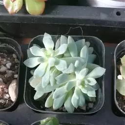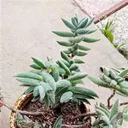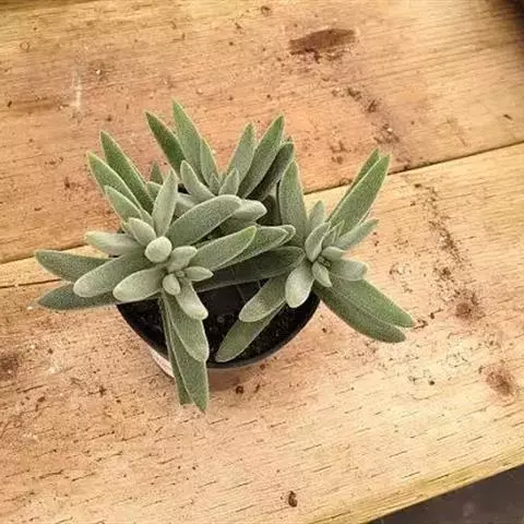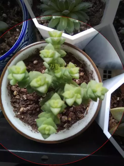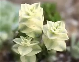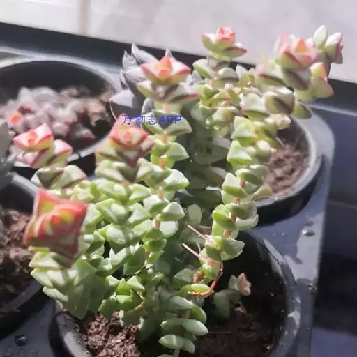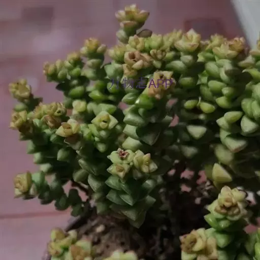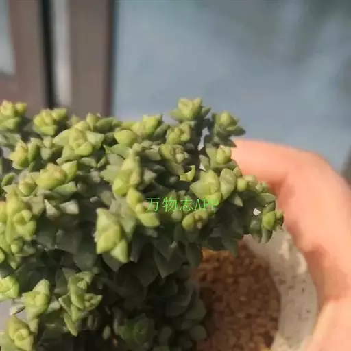 小米星为多年生肉质草本植物,植株直立丛生,多细小的分枝,茎肉质,多年生植株茎干逐渐半木质化,肉质叶呈灰绿至浅绿色,长约0.5厘米,宽约0.4厘米;叶缘稍具红色,在晚秋和早春,温差大的时候红色尤为明显。叶片交互对生,卵圆状三角形,无叶柄,基部连在一起,新叶上下叠生,成叶上下有少许间隔。4-5月开花,白色,星状,花瓣5-6瓣,簇生,常开满枝头,颇为华丽;开花后不会死。 [2-3] 小型品种,开花的植株高仅约12厘米。