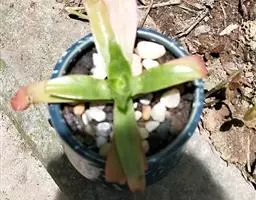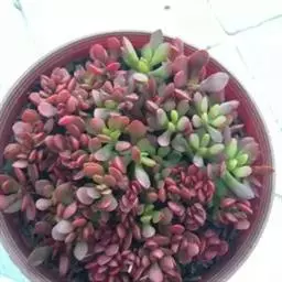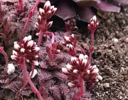 叶子表面宽厚,富肉质感且带有磨纱质感,看像石头质地;开红色小花,生于植株顶部,倒伞形密生,形状像花…